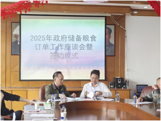 3月26日上午,衡糧集團三塘子公司在三樓會議室組織召開2025年政府儲備糧食訂單工作座談會,邀請了衡南縣、衡陽縣等周邊稻谷實際種植者代表參加洽談并現(xiàn)場簽約。衡陽市發(fā)改委調(diào)控科科長萬秋香、副科長周鐵鋼,衡糧集團黨委副書記、總經(jīng)理劉光蘭等出席會議,副總經(jīng)理尹培劍主持會議,三塘公司中層以上干部參加會議。